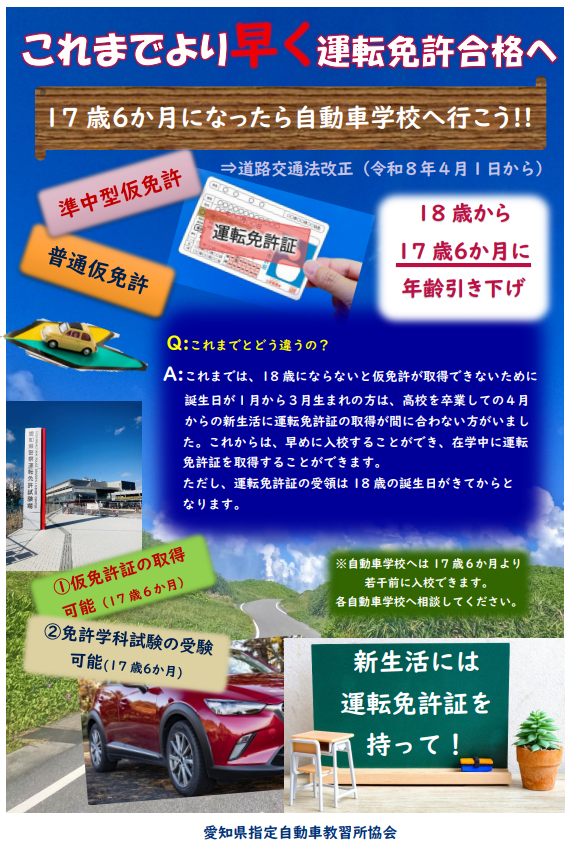 令和8年4月1日より、道路交通法の改正に伴い、普通免許・準中型免許における仮運転免許の取得可能年齢が「18歳」から「17歳6か月」に引き下げられます。これにより、これまでよりも早いタイミングで仮免許の取得が可能となり、18歳になればすぐに免許試験を受験できるようになります。